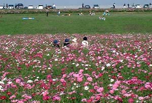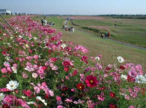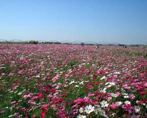 池袋から大宮を抜けて、吹上までは車で約2時間半。一般道は、ちょっとノロノロ運転で、ドライバーには退屈だけど、ふらっと出かけるにはちょうどいい距離です。 この荒川コスモス街道は、今年は、台風15号の影響で、例年の半分になってしまったとか。それでも、普段、花畑を目にすることがない私にとっては、感動もののコスモスでした。 |