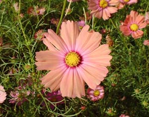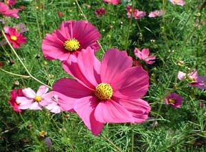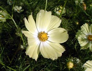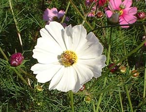 白いコスモス コスモスの属名はギリシア語で「秩序、調和、美しい、装飾」などを意味をするKosmosに由来しているとか。 |