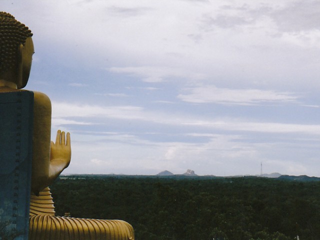 洞窟内に無数の仏様と壁画が。 | 聖地ダンブッラに何故か巨大な黄金の大仏・・・ 大船の観音様のような異様さです。 大仏さんからはジャングルの彼方に シーギリヤロックが見えます。 |